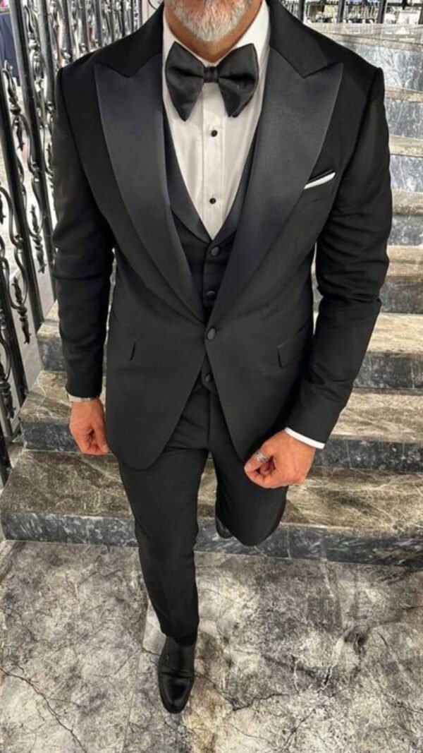 Ce costume trois pièces incarne le summum de l’élégance masculine. Parfait pour les grandes occasions, il allie sophistication et modernité avec sa coupe ajustée et ses finitions soignées. Le revers satiné ajoute une touche de luxe à la veste, tandis que le gilet assorti complète parfaitement l’ensemble. Porté avec une chemise blanche classique et un nœud papillon noir, ce costume offre un look raffiné et intemporel, idéal pour les mariages, galas ou soirées habillées.
