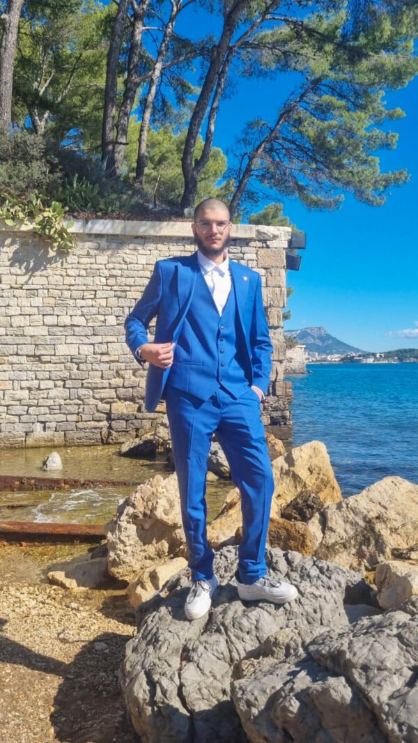 Ce costume trois pièces bleu incarne le summum de l’élégance masculine. Parfait pour les grandes occasions, il allie sophistication et modernité avec sa coupe ajustée et ses finitions soignées.