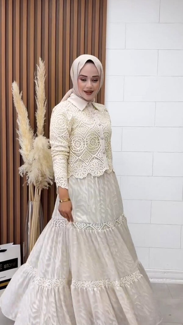 Élégance et raffinement sont au rendez-vous avec cette robe longue d’un blanc crème, accompagnée d’une veste en dentelle délicate. La robe, fluide et sophistiquée, est conçue pour allier confort et style, tandis que la veste en dentelle ajoute une touche de romantisme et de féminité. Les détails en dentelle soigneusement travaillés et les boutons sur la veste apportent une finition chic à l’ensemble. Idéale pour des soirées ou des événements formels, cette tenue complète fera sensation tout en restant discrète et distinguée.
