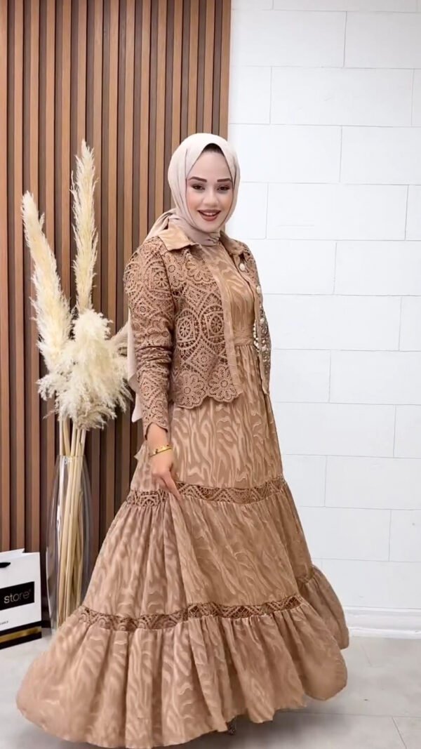 Élégance et raffinement sont au rendez-vous avec cette robe longue accompagnée d’une veste en dentelle délicate. La robe, fluide et sophistiquée, est conçue pour allier confort et style, tandis que la veste en dentelle ajoute une touche de romantisme et de féminité. Les détails en dentelle soigneusement travaillés et les boutons sur la veste apportent une finition chic à l’ensemble. Idéale pour des soirées ou des événements formels, cette tenue complète fera sensation tout en restant discrète et distinguée.