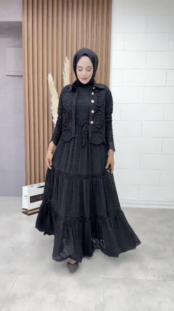 Élégance et raffinement sont au rendez-vous avec cette robe longue noire accompagnée d’une veste en dentelle délicate. La robe, fluide et sophistiquée, est conçue pour allier confort et style, tandis que la veste en dentelle ajoute une touche de romantisme et de féminité. Les détails en dentelle soigneusement travaillés et les boutons sur la veste apportent une finition chic à l’ensemble. Idéale pour des soirées ou des événements formels, cette tenue complète fera sensation tout en restant discrète et distinguée.