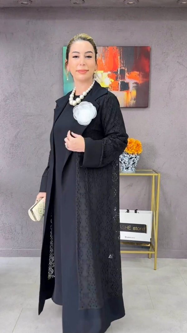 Cette robe longue élégante dans une teinte noire est l’incarnation du chic raffiné. Accompagnée d’un manteau léger en dentelle délicate, elle offre une allure sophistiquée parfaite pour des occasions spéciales.