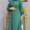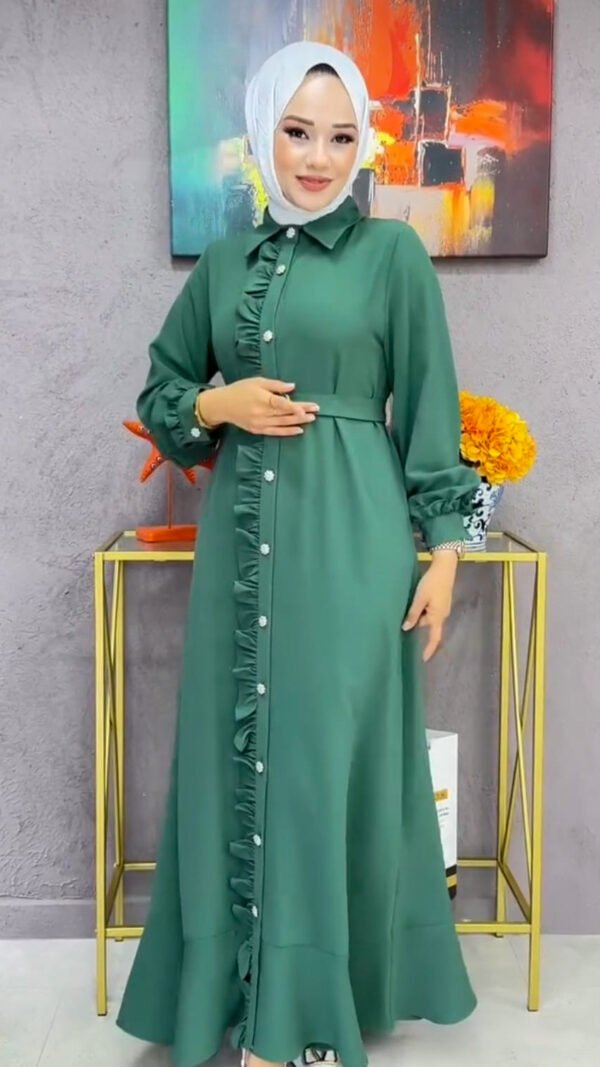 Ajoutez une touche de sophistication à votre garde-robe avec cette robe longue d’un vert profond. Ornée d’une rangée élégante de boutons sur le devant, accompagnée de détails à volants subtils, cette pièce se distingue par son allure à la fois féminine et moderne. Le tissu léger et fluide offre un confort optimal, tandis que la ceinture intégrée à la taille permet de définir la silhouette. Les manches légèrement bouffantes ajoutent un charme supplémentaire à ce modèle intemporel, parfait pour des occasions formelles ou des sorties élégantes.